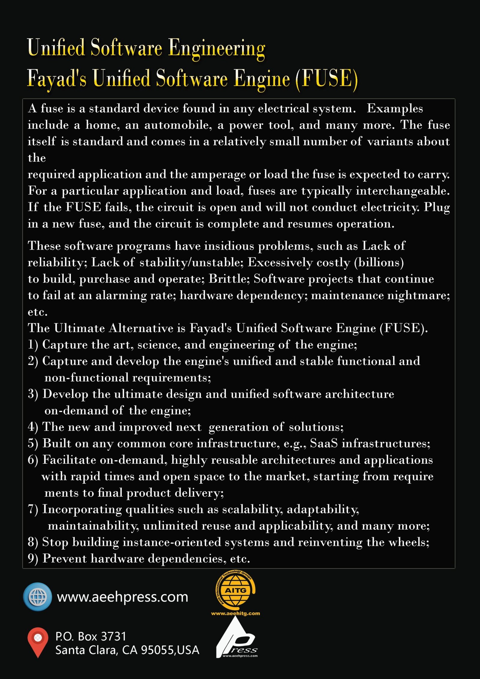 A fuse is a standard device found in any electrical system. Examples include a home, an automobile, a power tool, and many more. The fuse itself is standard and comes in a relatively small number of variants about the required application and the amperage or load the fuse is expected to carry. For a particular application and load, fuses are typically interchangeable. If the FUSE fails, the circuit is open and will not conduct electricity. Plug in a new fuse, and the circuit is complete and resumes operation. These software programs have insidious problems, such as Lack of reliability; Lack of stability/unstable; Excessively costly (billions) to build, purchase and operate; Brittle; Software projects that continue to fail at an alarming rate; hardware dependency; maintenance nightmare; etc. The Ultimate Alternative is Fayad’s Unified Software Engine (FUSE). 1) Capture the art, science, and engineering of the engine; 2) Capture and develop the engine’s unified and stable functional and non-functional requirements; 3) Develop the ultimate design and unified software architecture on-demand of the engine; 4) The new and improved next generation of solutions; 5) Built on any common core infrastructure, e.g., SaaS infrastructures; 6) Facilitate on-demand, highly reusable architectures and applications with rapid times and open space to the market, starting from require ments to final product delivery; 7) Incorporating qualities such as scalability, adaptability, maintainability, unlimited reuse and applicability, and many more; 8) Stop building instance-oriented systems and reinventing the wheels; 9) Prevent hardware dependencies, etc.