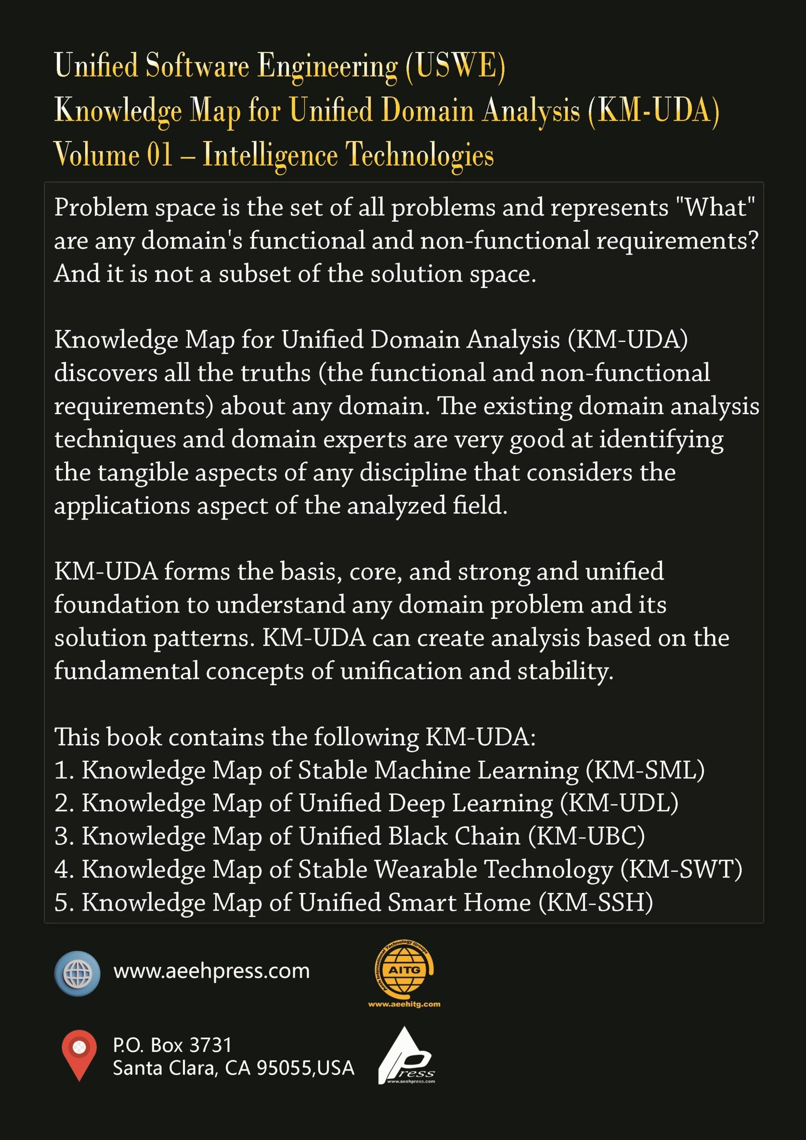 Problem space is the set of all problems and represents “What” are any domain’s functional and non-functional requirements? And it is not a subset of the solution space. Knowledge Map for Unified Domain Analysis (KM-UDA) discovers all the truths (the functional and non-functional requirements) about any domain. The existing domain analysis techniques and domain experts are very good at identifying the tangible aspects of any discipline that considers the applications aspect of the analyzed field. KM-UDA forms the basis, core, and strong and unified foundation to understand any domain problem and its solution patterns. KM-UDA can create analysis based on the fundamental concepts of unification and stability. This book contains the following KM-UDA: 1. Knowledge Map of Stable Machine Learning (KM-SML) 2. Knowledge Map of Unified Deep Learning (KM-UDL) 3. Knowledge Map of Unified Black Chain (KM-UBC) 4. Knowledge Map of Stable Wearable Technology (KM-SWT) 5. Knowledge Map of Unified Smart Home (KM-SSH)