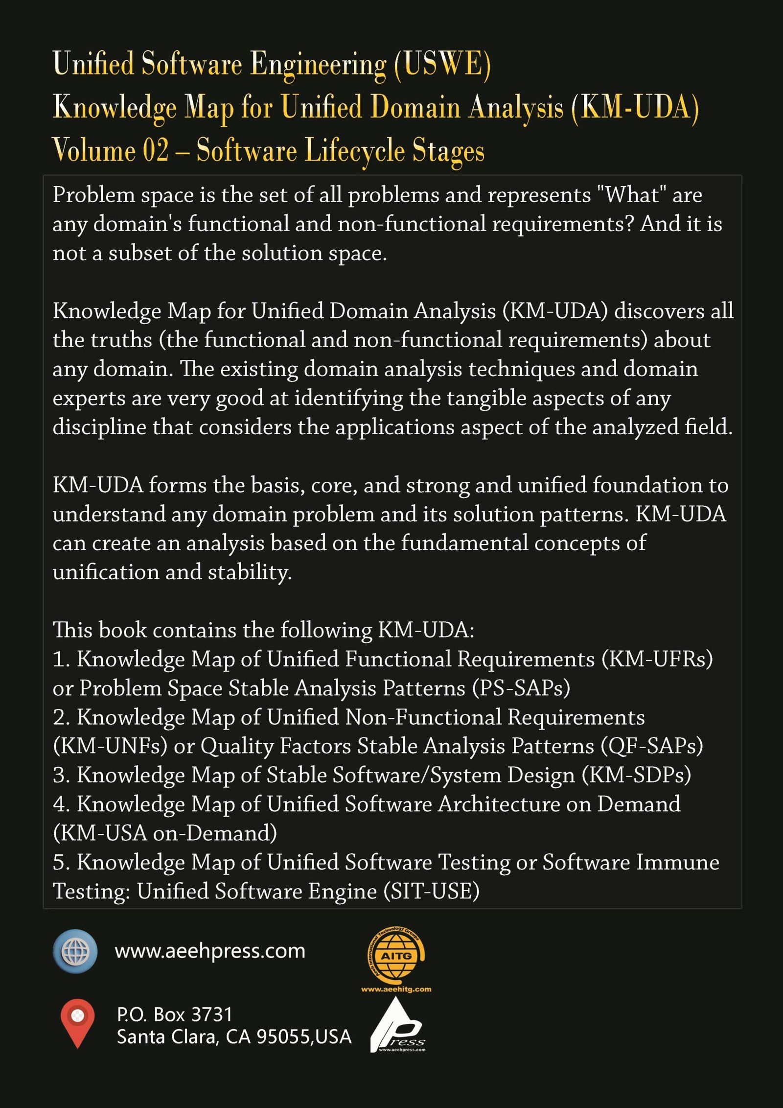 Problem space is the set of all problems and represents “What” are any domain’s functional and non-functional requirements? And it is not a subset of the solution space. Knowledge Map for Unified Domain Analysis (KM-UDA) discovers all the truths (the functional and non-functional requirements) about any domain. The existing domain analysis techniques and domain experts are very good at identifying the tangible aspects of any discipline that considers the applications aspect of the analyzed field. KM-UDA forms the basis, core, and strong and unified foundation to understand any domain problem and its solution patterns. KM-UDA can create an analysis based on the fundamental concepts of unification and stability. This book contains the following KM-UDA: 1. Knowledge Map of Unified Functional Requirements (KM-UFRs) or Problem Space Stable Analysis Patterns (PS-SAPs) 2. Knowledge Map of Unified Non-Functional Requirements (KM-UNFs) or Quality Factors Stable Analysis Patterns (QF-SAPs) 3. Knowledge Map of Stable Software/System Design (KM-SDPs) 4. Knowledge Map of Unified Software Architecture on Demand (KM-USA on-Demand) 5. Knowledge Map of Unified Software Testing or Software Immune Testing: Unified Software Engine (SIT-USE)